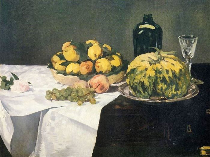 Still Life with Melon and Peaches is a famous oil painting, originally by French artist édouard Manet in 1866, with the style of impressionism. The painting now is collected by National Gallery of Art. This kind of still life oil paintings is very common in visual art. Besides, recommend you to view other painting artworks from édouard Manet.